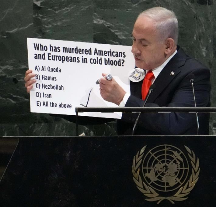 È stato però anche piacevole vedere decine di delegati ONU lasciare la stanza davanti al criminale di guerra e genocida Netanyahu.